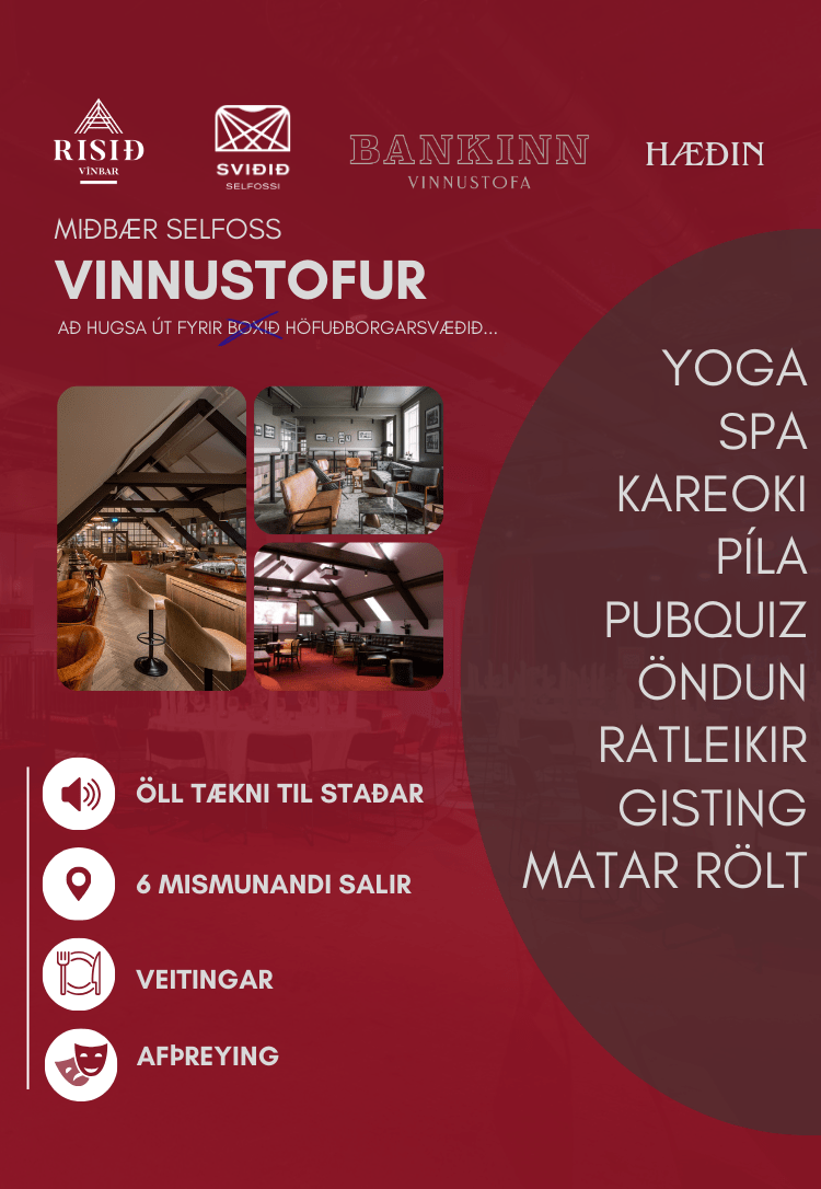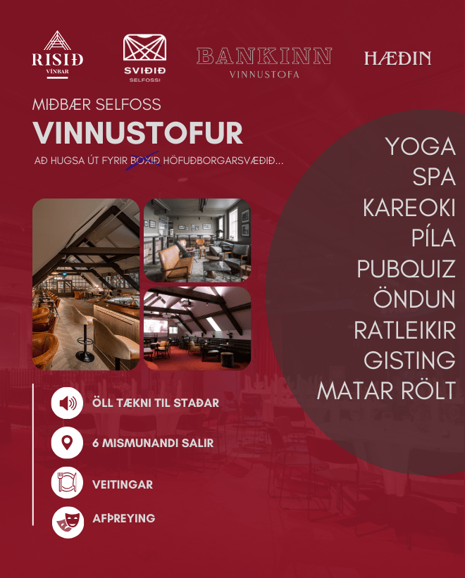 Í Miðbæ Selfoss bjóðum við upp á fjölbreytta salarleigu fyrir fyrirtæki, hópa og einstaklinga. Hvort sem þú ert að skipuleggja fund, ráðstefnu, vinnustofu, teymisdag, afmæli, árshátíð eða skemmtun, þá finnur þú sal sem hentar og meira til. Við rekum nokkrar ólíkar staðsetningar, hver með sinn karakter, stemningu og möguleika. Sameiginlegt er fagleg þjónusta, tæknibúnaður og reynsla af því að gera viðburði eftirminnilega.